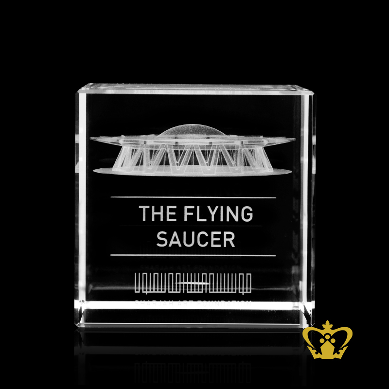 Crystal-cube-engrave-with-The-Flying-Saucer-3D-laser-customize-text-and-logo Product Product Product Product