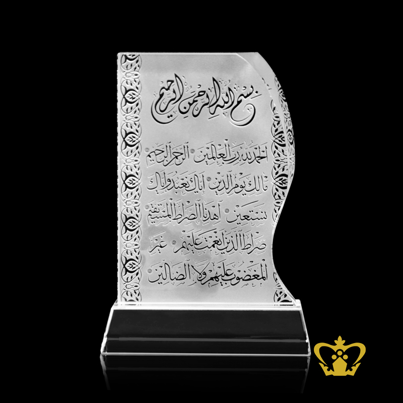 Arabic word calligraphy Surah Al-Fatihah engraved crystal wave plaque customized Islamic occasion gift Ramadan Eid souvenir
