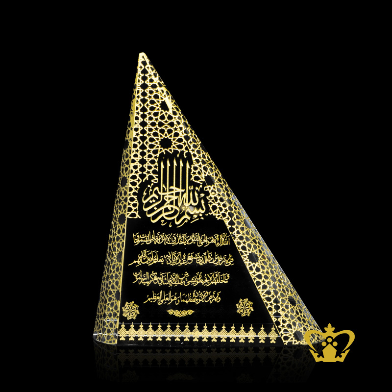 Crystal Gallery represent the craft traditions of the Islamic world with uncompromising quality and exceptional craftsmanship: to bring you a fine selection of unique handcrafted crystal corporate Islamic Gifts. Our Islamic artifacts gift decor collections are increasingly popular locally in Dubai, UAE, GCC and abroad. With a portfolio of high profile clients, our luxury giveaways have added the perfect awe-aspiring touch to many occasions and events. Our brand is widely recognized and endorsed by our clients for its classy Islamic gift collections and excellence of service. We design experiences in the world of luxury corporate gifts. This Modern Islamic Art handcrafted decorative item is the perfect addition to your home decor! Also can makes a great housewarming gift, Eid Gift, Ramadan Gift, Shahadah, gift for someone returning home from Hajj! The Throne Verse Ayat al Kursi is the 255th verse of the 2nd surah of the Quran, Al-Baqara. The verse speaks about how nothing and nobody is regarded to be comparable to God. It is one of the best-known verses of the Quran and is widely memorized and displayed in the Islamic world.Personalized / Customized content such as logos, text or pictures can be engraved / etched on the main body of this product at an additional charge.