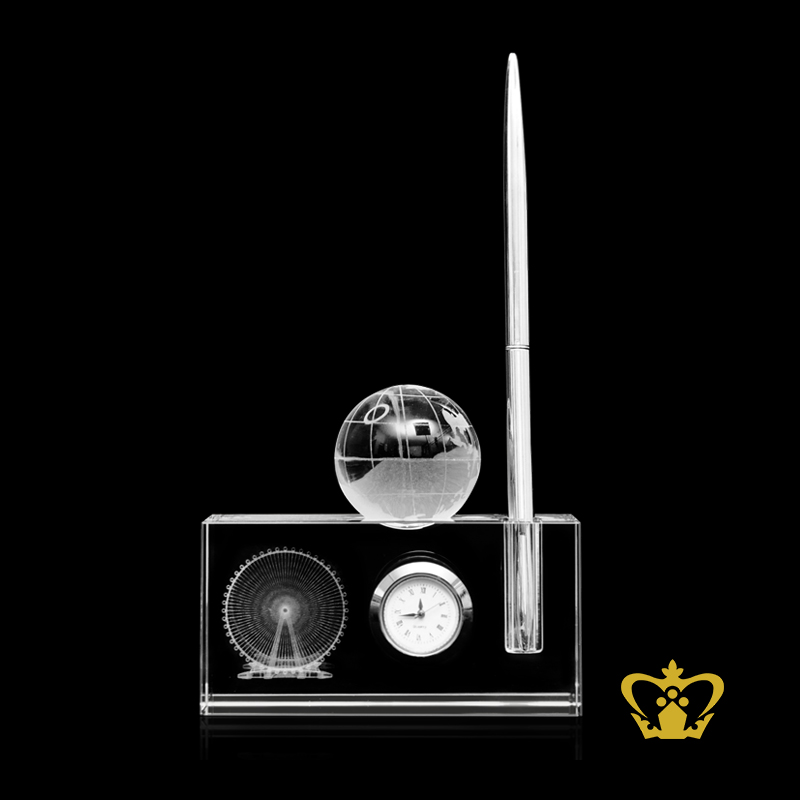 Ain Dubai 3D laser engraved crystal cube pen holder with clock and globe for desktop customized with your name designation logo
