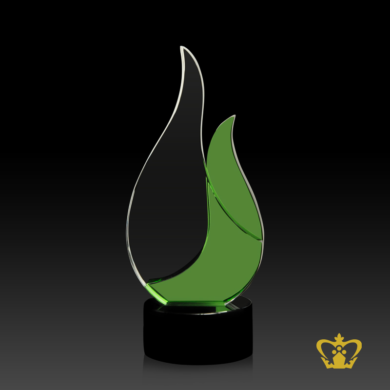Flame-trophy-green-and-clear-crystal-with-round-black-base-customized-logo-text Product Product Product