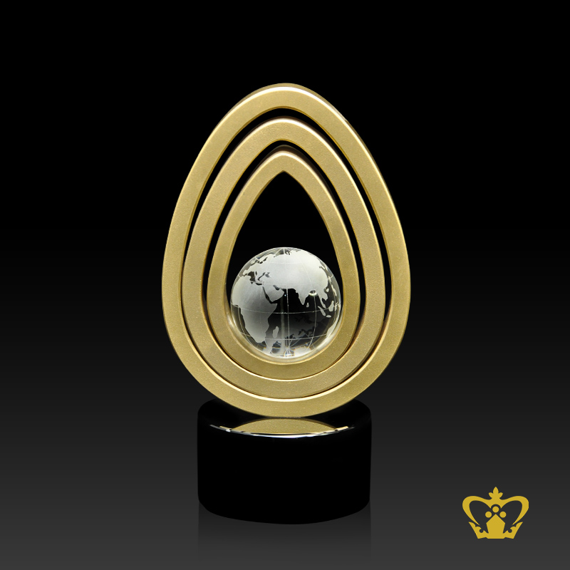 Manufactured artistry globe crystal drop shape trophy stands on black crystal circle base customize text logo engrave