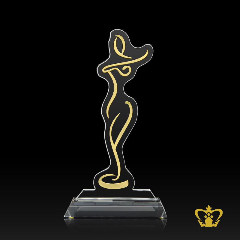 Crystal-cutout-trophy-of-lady-with-gold-inlay-stands-on-clear-crystal-base-customized-text-engraving-logo Product Product Product Product