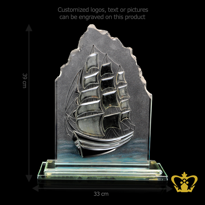 The beautiful crystal plaque representing the sea vessel will look simply stunning on the mantelpiece. Personalized / Customized content such as logos, text can be engraved / etched on the Base of this product at an additional charge. Our customizable award plaques available in different shapes and styles that will be suitable for any occasion. Choose from our unique plaques for ongoing awards, corporate gift in various event, or single plaques to recognize individual achievement. Custom engraved plaques come in a variety of materials, such as crystal, glass, wood, metal and acrylic. We recommend sorting through our selection for traditional, memorial, and photo plaques as well. Whatever plaque you choose, we can add custom engravings to any of the items that interest you. Our advanced engraving services can place your organization's logo directly onto the plate. Order yours online today by click on customize button and upload your logo or image and text, you can also click on enquiry button we will respond as soon as we can.