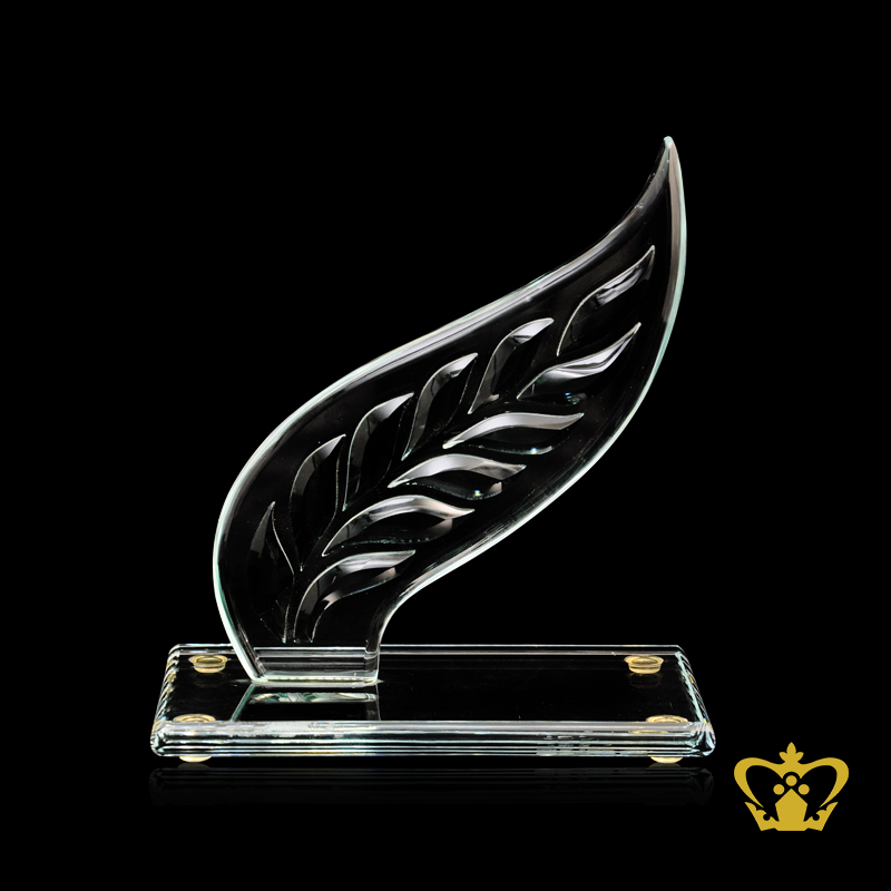 Personalized-crystal-trophy-with-leaf-theme-stands-on-clear-base Product Product Product