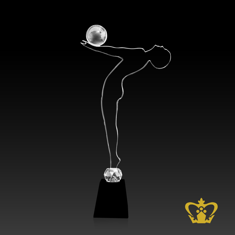 Personalized crystal man cutout with globe on hand stands on black base customize text engraving logo