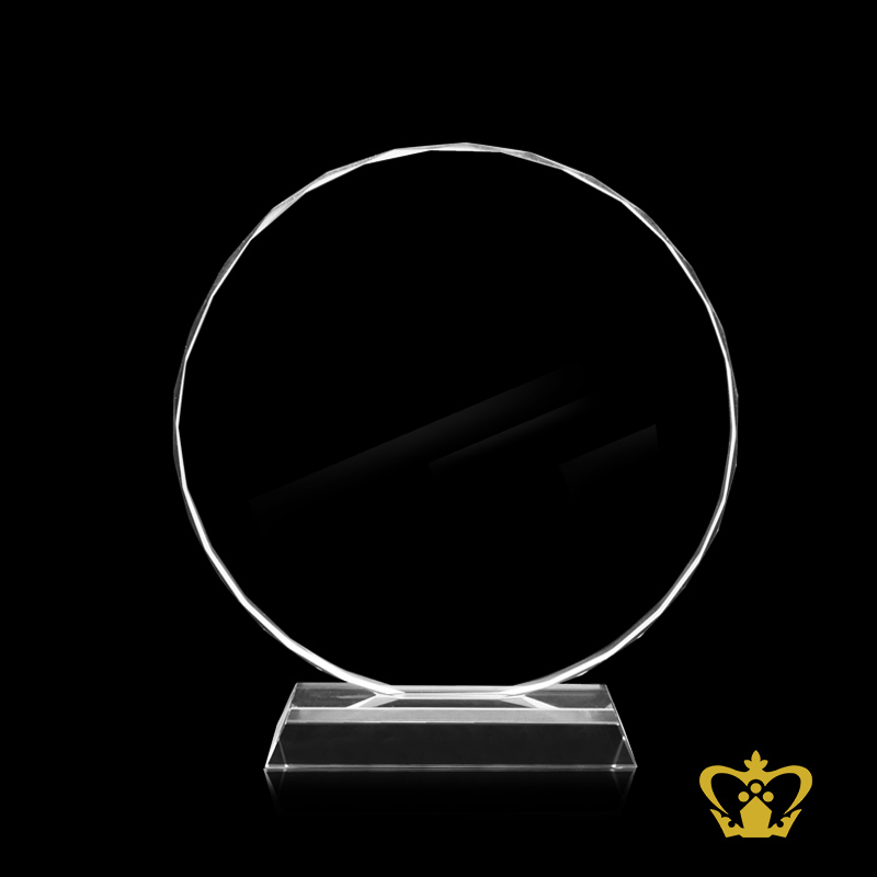 Circle crystal trophy with facet diamond cuts on edges with clear base customized logo text