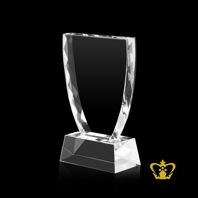 The Semi Oval crystal trophy will look excellent on the mantelpiece. A trophy is a tangible, durable reminder of a specific achievement, and serves as recognition or evidence of merit. Trophies are often awarded for sporting events, from youth sports to professional level athletics. In many sports medals are often given out either as the trophy or along with more traditional trophies. For honoring an individual achievement, top performers, or the whole team, we have the perfect recognition items to fit your needs. Our selection of custom awards, plaques, cutout, memento, replicas and trophies are perfect for everything from small office celebrations to largescale corporate events. Get your awards and trophies customized artwork, we will make sure the designs fit your needs before you pay anything. Our crystal laser engraved trophies are a lasting symbol of corporate and employee recognition. Our expert design team specializes in creating unique, custom award trophies for businesses that will fit any budget. Crystal Gallery's custom awards are memorable tokens of your appreciation. Our expert in-house factory and engravers specialize in custom crystal-cut logos, custom printed acrylic awards for full-color designs, and unique etching with 3D crystal laser awards.