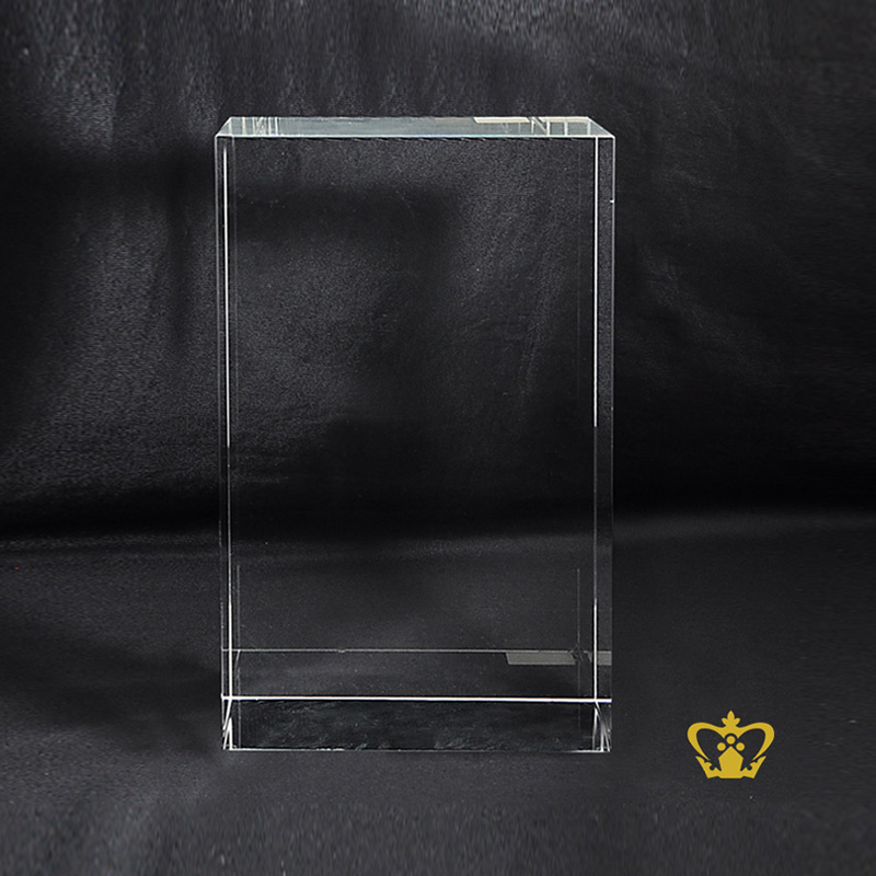 You can personalize this crystal cube or rectangular crystal block by engrave your own photo, logo, text, design or any ideas. Click on customize button and upload your image or text and buy online, you can also click on enquiry button we will respond as soon as we can. To produce a 3D crystal, firstly our designers transform any of your ordinary photographs into amazingly 3D images. Then it imprinted or engraved in glass cube using our precision laser technology in crystal cube. 3D crystal cube or blocks are often used for 3D or 2D crystal portraits and given as gifts for wedding, birthdays, Valentine's Day, mother's day, father's day, graduation, convocation , remembrance, memorial or anniversary gift. There are also great corporate or business gifts for recognition awards, promotional paperweights and event mementos. Corporate logos laser engraved inside of the crystal make elegant client and employee gifts. These laser crystals accommodate 3D layered designs where text and image can be engraved at different depths in the crystal. You can add an optional light base and the interaction of the white LED light with the engraving creates bright and sparkling 3D keepsake. Personalized content such as logos, text or pictures can be engraved on the main body or base of this product at an additional charge. This product can be fitted with a crystal or wooden base with engraving at an additional cost. Please click on the send enquiry button, we will revert within 12 working hours