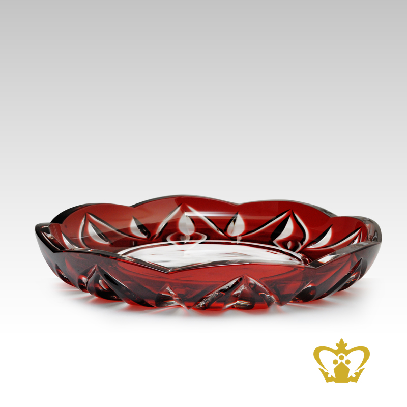 Exquisite red crystal centerplate handcrafted decorative plate. Crafted in lead crystal with our signature traditional and contemporary designs. Crystal Gallery's decorative centerplate collection is the epitome of strong craftsmanship. The handcrafted cuts in clear crystal and a shiny appeal give this crystal plate a traditional touch that is hard to be missed. This crystal decorative centerplate makes a great housewarming gift or even ideal for any occasion. Our superior products are only produced by hand in a time consuming process, with excellence in every detail. Each high quality and exclusive crystal decorative center plate is unique and is produced by the glasssmiths with the use of their extensive experience and skills. Elaborate finishing techniques are used, such as cutting, engraving and producing matt finishes, which gives Crystal Gallery its exceptional clarity and brilliance. With careful craftsmanship and lots of love in the detail successfully creates an amazing crystal product like crystal center plates. Because everything is made by hand and every glasssmith has much experience, one of a kind crystal products will be produced. The absolute perfection and craftsmanship of our crystal glass makers are reflected in all our crystal collections. Experience exclusive crystal gifts, masterfully processed into sophisticated crystal centerplates