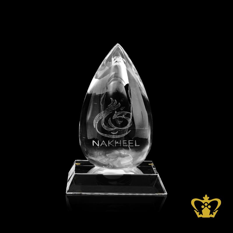 Personalized-crystal-drop-trophy-laser-engraved-logo-and-text-NAKHEEL-with-clear-base Product Product