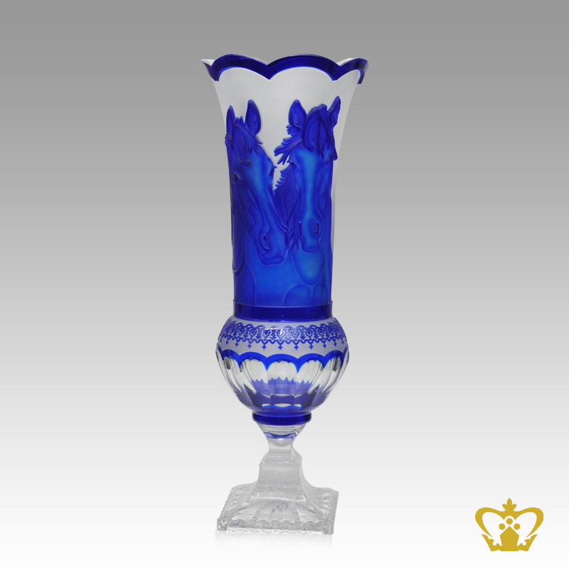 Beautiful effigies of horses drenched in blue bring glamour to this stately vase. Crafted in lead crystal with our signature traditional and contemporary cutting patterns. Crystal Gallery's decorative vases collection is the epitome of strong craftsmanship. The handcrafted cuts in clear crystal and a shiny appeal give this crystal vase a traditional touch that is hard to be missed. This crystal vases makes a great housewarming gift or even ideal for any occasion. Our superior products are only produced by hand in a time consuming process, with excellence in every detail. Each high quality and exclusive crystal decorative vase is unique and is produced by the glasssmiths with the use of their extensive experience and skills. Elaborate finishing techniques are used, such as cutting, engraving and producing matt finishes, which gives Crystal Gallery its exceptional clarity and brilliance. Subtle, barely noticeable differences between the glasses are evidence of real hand-made products. Nizza, Dresden, Red Poppy, Tulipa or Luxury - all these sonorous collections are complemented by fascinatingly designed vases. They are a real feast for the eyes, which extremely intensify the effect of the flower arrangements arranged in them. With careful craftmanship and lots of love in the detail successfully creates an amazing crystal glass product like crystal vase and bowl. Because everything is made by hand and every glasssmith has much experience, one of a kind crystal glass products will be produced. The absolute perfection and craftsmanship of our crystal glass makers are reflected in all our crystal glass collections. Experience exclusive crystal glass, masterfully processed into sophisticated glasses, vases and bowls.