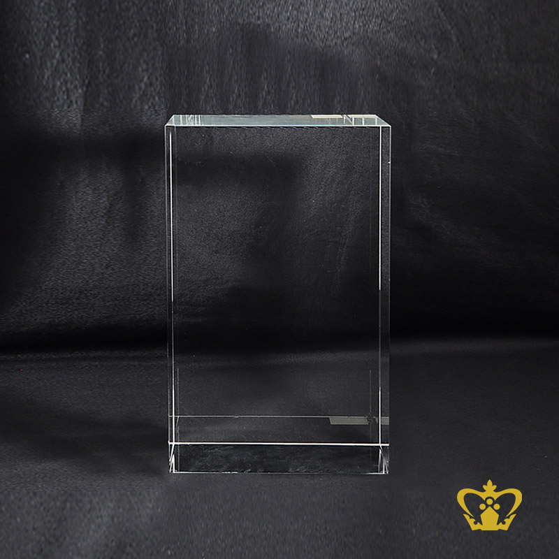 The crystal cube measures 300x230x100 MM & can brilliantly accommodate 3D & 2D images. You can personalize this crystal cube or rectangular crystal block by engrave your own photo, logo, text, design or any ideas. Click on customize button and upload your image or text and buy online, you can also click on enquiry button we will respond as soon as we can. To produce a 3D crystal, firstly our designers transform any of your ordinary photographs into amazingly 3D images. Then it imprinted or engraved in glass cube using our precision laser technology in crystal cube. 3D crystal cube or blocks are often used for 3D or 2D crystal portraits and given as gifts for wedding, birthdays, Valentine's Day, mother's day, father's day, graduation, convocation , remembrance, memorial or anniversary gift. There are also great corporate or business gifts for recognition awards, promotional paperweights and event mementos. Corporate logos laser engraved inside of the crystal make elegant client and employee gifts. These laser crystals accommodate 3D layered designs where text and image can be engraved at different depths in the crystal. You can add an optional light base and the interaction of the white LED light with the engraving creates bright and sparkling 3D keepsake.