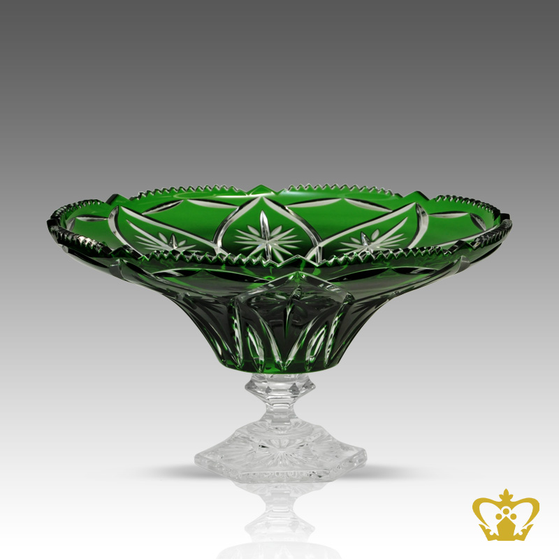 A zigzag jagged rim and decorative cuts adorn this crystal green-colored stem bowl.