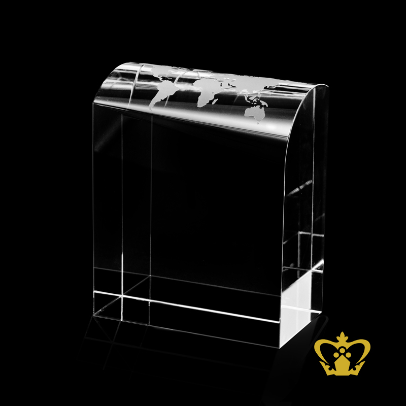 Rectangular crystal block trophy with world map engraving on top customized logo text