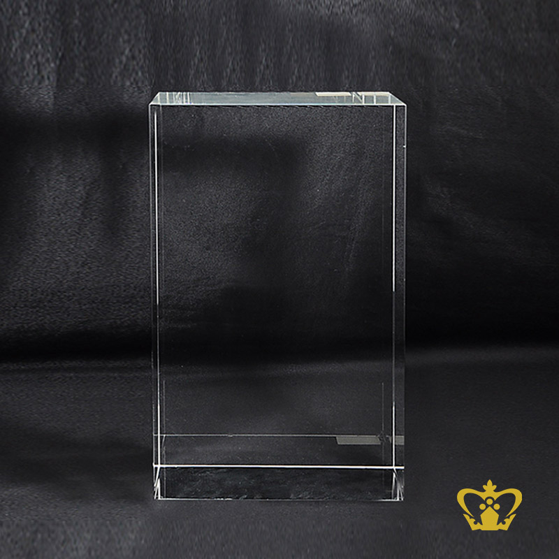 You can personalize this crystal cube or rectangular crystal block by engrave your own photo, logo, text, design or any ideas. Click on customize button and upload your image or text and buy online, you can also click on enquiry button we will respond as soon as we can. To produce a 3D crystal, firstly our designers transform any of your ordinary photographs into amazingly 3D images. Then it imprinted or engraved in glass cube using our precision laser technology in crystal cube. 3D crystal cube or blocks are often used for 3D or 2D crystal portraits and given as gifts for wedding, birthdays, Valentine's Day, mother's day, father's day, graduation, convocation , remembrance, memorial or anniversary gift. There are also great corporate or business gifts for recognition awards, promotional paperweights and event mementos. Corporate logos laser engraved inside of the crystal make elegant client and employee gifts. These laser crystals accommodate 3D layered designs where text and image can be engraved at different depths in the crystal. You can add an optional light base and the interaction of the white LED light with the engraving creates bright and sparkling 3D keepsake.
