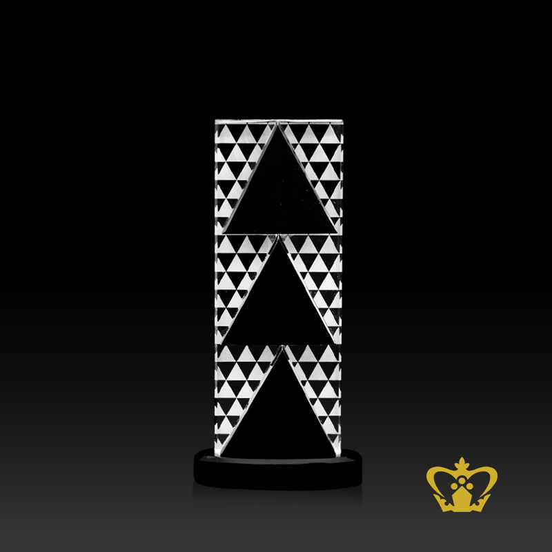 A trio of black triangles strategically set in a row amidst a crystal backdrop. Personalized / Customized content such as logos, text can be engraved / etched on the main body or base of this product at an additional charge. For honoring an individual achievement, top performers, or the whole team, we have the perfect recognition items to fit your needs. Our selection of custom awards, plaques, cutout, memento, replicas and trophies are perfect for everything from small office celebrations to largescale corporate events. Get your awards and trophies customized artwork, we will make sure the designs fit your needs before you pay anything. Our crystal laser engraved trophies are a lasting symbol of corporate and employee recognition. Our expert design team specializes in creating unique, custom award trophies for businesses that will fit any budget. Crystal Gallery’s custom awards are memorable tokens of your appreciation. Our expert in-house factory and engravers specialize in custom crystal-cut logos, custom printed acrylic awards for full-color designs, and unique etching with 3D crystal laser awards.
