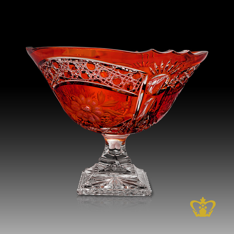 Charming graceful red crystal footed bowl handcrafted with intense gorgeous floral diamond pattern and flower hand engraved decorative gift