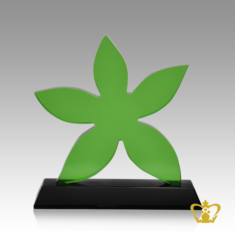 Personalized-crystal-trophy-theme-green-leaf-cutout-with-black-base-customize-text-logo-engraving Product Product Product Product