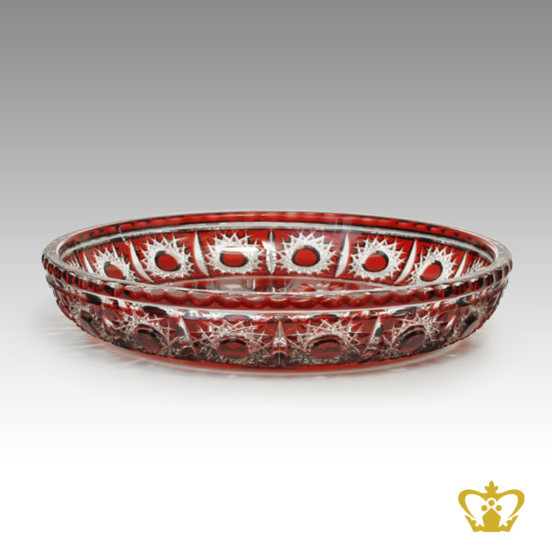 Exquisite red crystal centerplate handcrafted decorative plate. Crafted in lead crystal with our signature traditional and contemporary designs. Crystal Gallery's decorative centerplate collection is the epitome of strong craftsmanship. The handcrafted cuts in clear crystal and a shiny appeal give this crystal plate a traditional touch that is hard to be missed. This crystal decorative centerplate makes a great housewarming gift or even ideal for any occasion. Our superior products are only produced by hand in a time consuming process, with excellence in every detail. Each high quality and exclusive crystal decorative center plate is unique and is produced by the glasssmiths with the use of their extensive experience and skills. Elaborate finishing techniques are used, such as cutting, engraving and producing matt finishes, which gives Crystal Gallery its exceptional clarity and brilliance. With careful craftsmanship and lots of love in the detail successfully creates an amazing crystal product like crystal center plates. Because everything is made by hand and every glasssmith has much experience, one of a kind crystal products will be produced. The absolute perfection and craftsmanship of our crystal glass makers are reflected in all our crystal collections. Experience exclusive crystal gifts, masterfully processed into sophisticated crystal centerplates