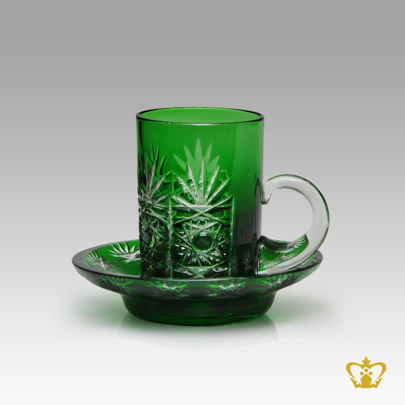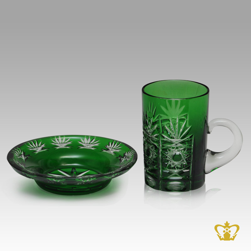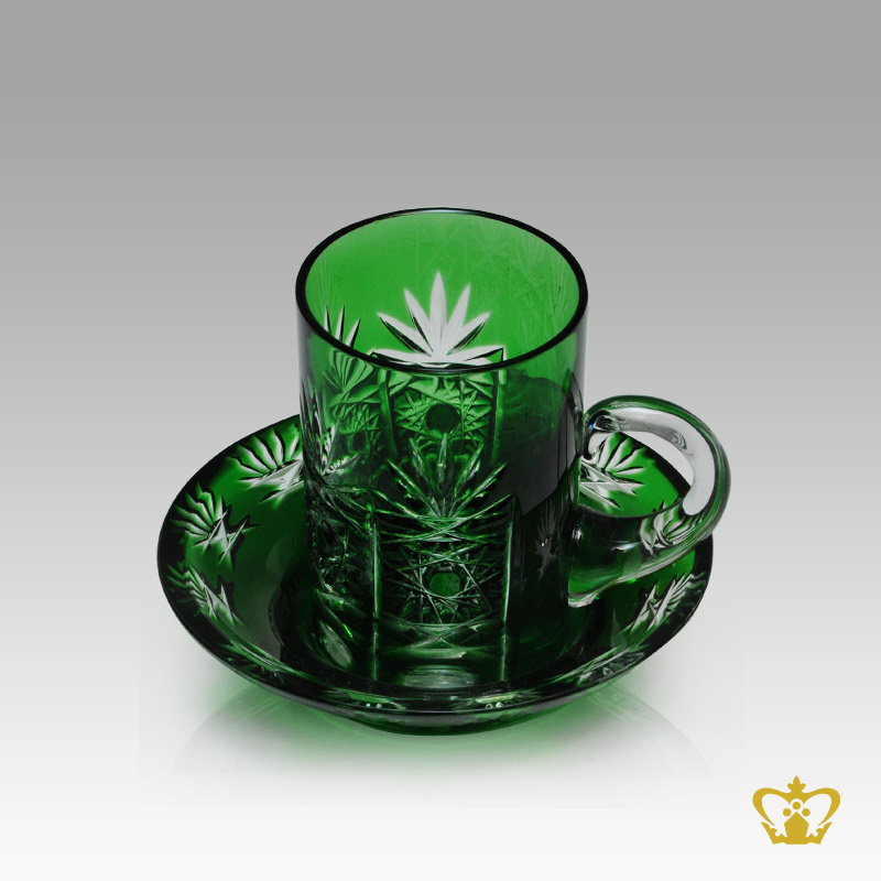 Emerald-green-crystal-tea-cup-and-saucer-embellished-with-enticing-cuts-intense-star-leaf-hand-carved-pattern Product Product Product