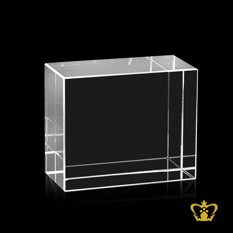 The crystal block measures 200 x 200 x 100 mm & can brilliantly accommodate 3D images. You can personalize this crystal cube or rectangular crystal block by engrave your own photo, logo, text, design or any ideas. Click on customize button and upload your image or text and buy online, you can also click on enquiry button we will respond as soon as we can. To produce a 3D crystal, firstly our designers transform any of your ordinary photographs into amazingly 3D images. Then it imprinted or engraved in glass cube using our precision laser technology in crystal cube. 3D crystal cube or blocks are often used for 3D or 2D crystal portraits and given as gifts for wedding, birthdays, Valentine's Day, mother's day, father's day, graduation, convocation , remembrance, memorial or anniversary gift. There are also great corporate or business gifts for recognition awards, promotional paperweights and event mementos. Corporate logos laser engraved inside of the crystal make elegant client and employee gifts. These laser crystals accommodate 3D layered designs where text and image can be engraved at different depths in the crystal. You can add an optional light base and the interaction of the white LED light with the engraving creates bright and sparkling 3D keepsake.