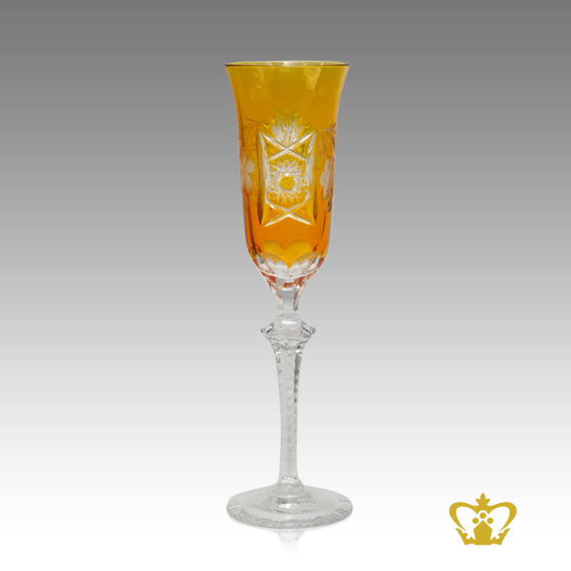 Alluring amber vintage elegant crystal champagne flute with intense timeless pattern enhanced hand carved stylish clear stem
