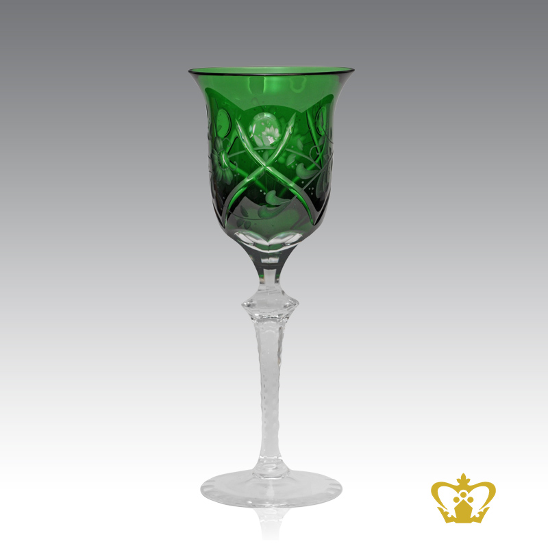 Emerald green crystal wine goblet with floral pattern hand engraved and elegantly carved stem