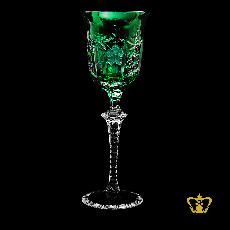 Emerald green elegant red wine crystal goblet with intense star cuts and grapevine hand carved stylish clear stem