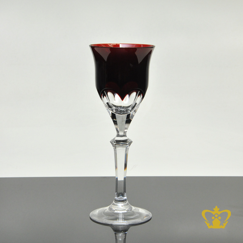 Modest copper ruby tulip shaped crystal liqueur glass with classic curved facets pattern elegantly hand carved stem