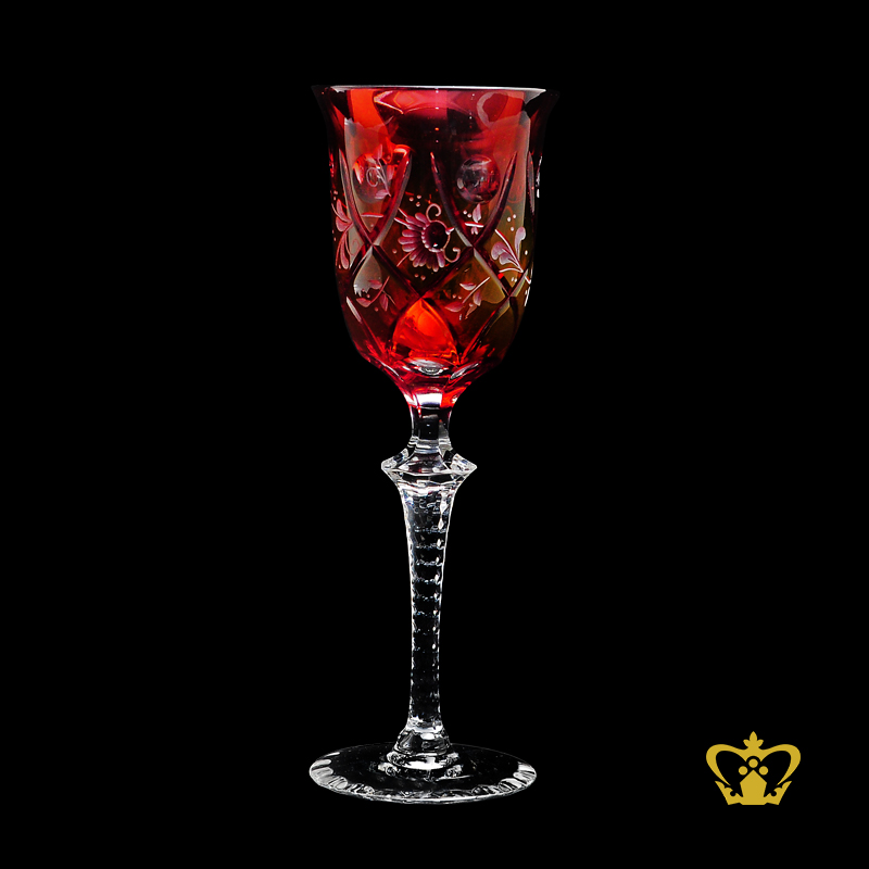 Luxurious Red elegant wine crystal goblet with intense floral pattern hand carved stylish clear stem