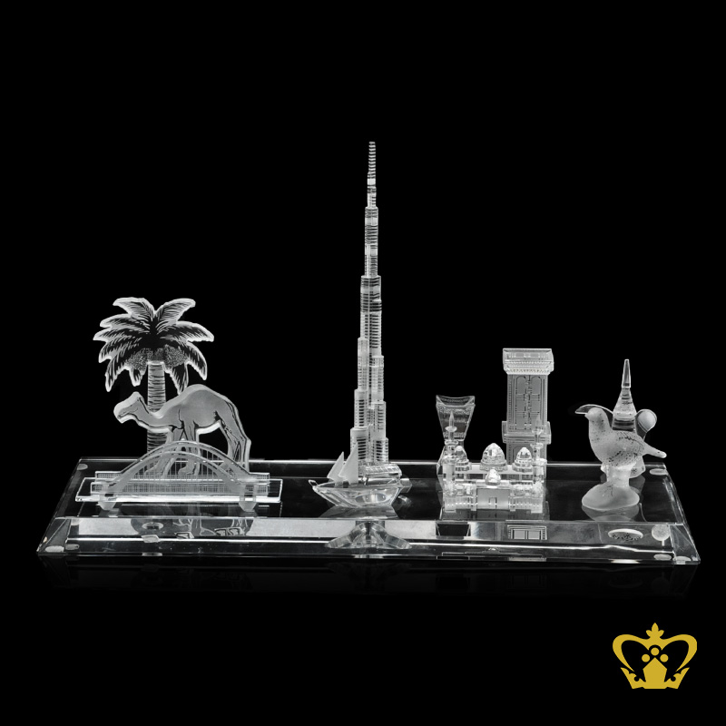 UAE famous landmark and replicas of Burj Khalifa camel dhow bukhoor mosque etc handcrafted in crystal with clear base