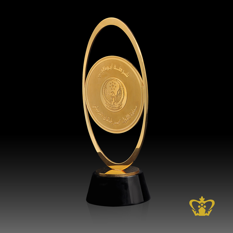 Custom-Made-Gold-Metal-Trophy-with-Intricate-Detailing-stands-on-a-Clear-Round-Black-Crystal-Base Product Product Product