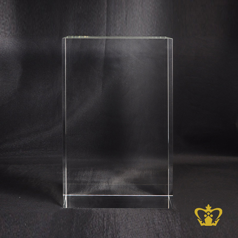 You can personalize this crystal cube or rectangular crystal block by engrave your own photo, logo, text, design or any ideas. Click on customize button and upload your image or text and buy online, you can also click on enquiry button we will respond as soon as we can. To produce a 3D crystal, firstly our designers transform any of your ordinary photographs into amazingly 3D images. Then it imprinted or engraved in glass cube using our precision laser technology in crystal cube. 3D crystal cube or blocks are often used for 3D or 2D crystal portraits and given as gifts for wedding, birthdays, Valentine's Day, mother's day, father's day, graduation, convocation , remembrance, memorial or anniversary gift. There are also great corporate or business gifts for recognition awards, promotional paperweights and event mementos. Corporate logos laser engraved inside of the crystal make elegant client and employee gifts. These laser crystals accommodate 3D layered designs where text and image can be engraved at different depths in the crystal. You can add an optional light base and the interaction of the white LED light with the engraving creates bright and sparkling 3D keepsake. Personalized content such as logos, text or pictures can be engraved on the main body or base of this product at an additional charge. This product can be fitted with a crystal or wooden base with engraving at an additional cost. Please click on the send enquiry button, we will revert within 12 working hours