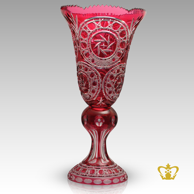 Graceful ruby red long footed elegant crystal vase embellished with trendy hand carved pattern
