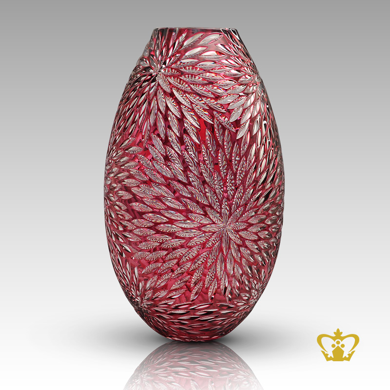 Stunning ruby red crystal vase allured with luminous leaf cuts a beautiful decorative gift.Crafted in lead crystal with our signature traditional and contemporary cutting patterns. Crystal Gallery's decorative vases collection is the epitome of strong craftsmanship. The handcrafted cuts in clear crystal and a shiny appeal give this crystal vase a traditional touch that is hard to be missed. This crystal vases makes a great housewarming gift or even ideal for any occasion. Our superior products are only produced by hand in a time consuming process, with excellence in every detail. Each high quality and exclusive crystal decorative vase is unique and is produced by the glasssmiths with the use of their extensive experience and skills. Elaborate finishing techniques are used, such as cutting, engraving and producing matt finishes, which gives Crystal Gallery its exceptional clarity and brilliance. Subtle, barely noticeable differences between the glasses are evidence of real hand-made products. Nizza, Dresden, Red Poppy, Tulipa or Luxury - all these sonorous collections are complemented by fascinatingly designed vases. They are a real feast for the eyes, which extremely intensify the effect of the flower arrangements arranged in them. With careful craftmanship and lots of love in the detail successfully creates an amazing crystal glass product like crystal vase and bowl. Because everything is made by hand and every glasssmith has much experience, one of a kind crystal glass products will be produced. The absolute perfection and craftsmanship of our crystal glass makers are reflected in all our crystal glass collections. Experience exclusive crystal glass, masterfully processed into sophisticated glasses, vases and bowls.