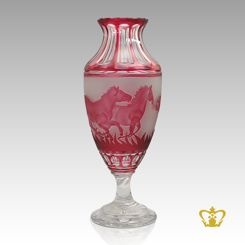 Timeless-enchanting-crystal-vase-with-running-horses-hand-carved-in-pink-hue-lovely-decorative-gift- Product Product