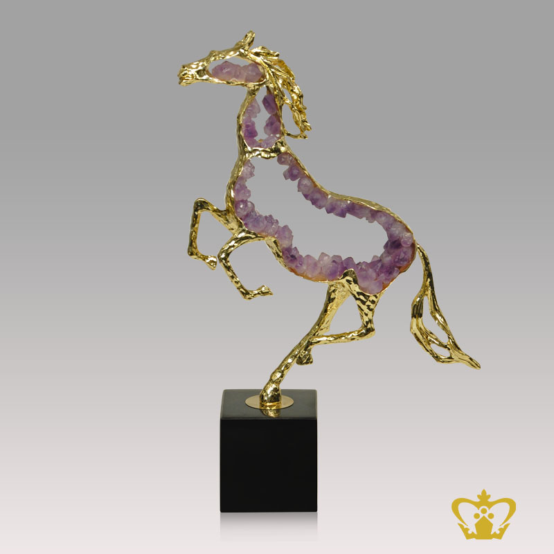 Metal horse replica with purple crystal stone and black marble base customize text logo engraving