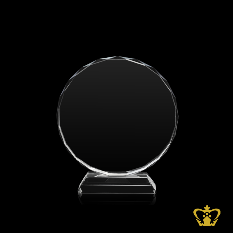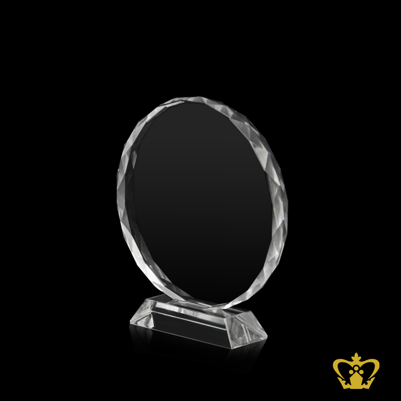 Crystal circle trophy with facet diamond cuts on edges with clear base customized logo text