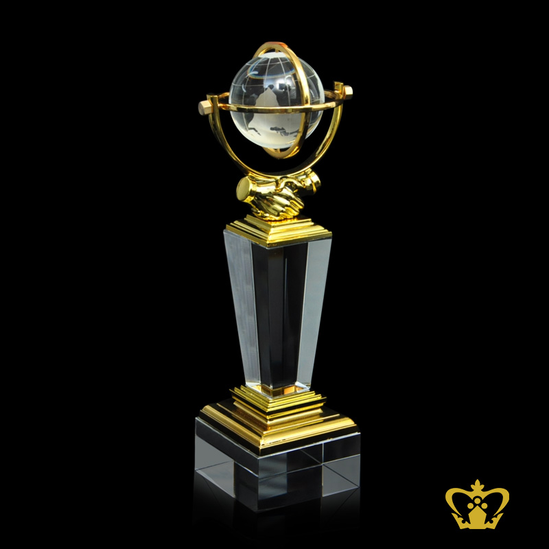 Metal-golden-hand-shake-replica-with-crystal-globe-and-clear-base-customized-logo-text-engraving Product Product Product